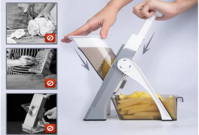 3. VIŠESTRANI: Kriška, julienne, šibica, kockice i još mnogo toga za jednostavnu pripremu obroka, sa 8 različitih unapred podešenih rezova za različite debljine (1-8 mm). Podešivač debljine omogućava prilagođenu kontrolu dajući vam savršena variva, supe, salate, povrće, čak i domaći čips od krompira