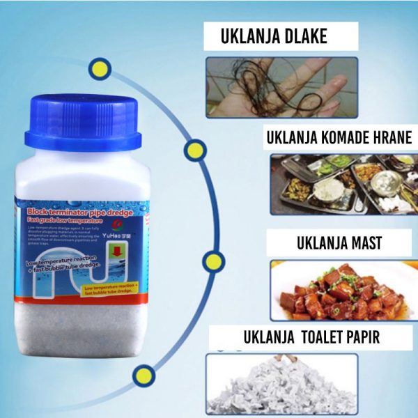 Ovaj jedinstveni univerzalni prašak za čišćenje i otpušavanje odvoda konačno će rešiti problem zapušenih kada, tuš kabina, lavaboa i sudopera! Voda se neće više zadržavati u njima zbog nataloženih nečistoća niti će se neprijatni mirisi iz navedenih mesta širiti.